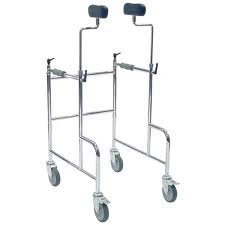 Dieser Gehwagen wurde als Mobilisations-und Gehhilfe für den therapeutischen Einsatz entwickelt. Durch die Achselauflagen werden Arme und Hände entlastet und die vier Schwenkrollen erlauben Drehungen auf engstem Raum.