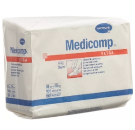 Vliesstoff-Kompresse aus 70% Zellwolle und 30% Polyesterfasern.